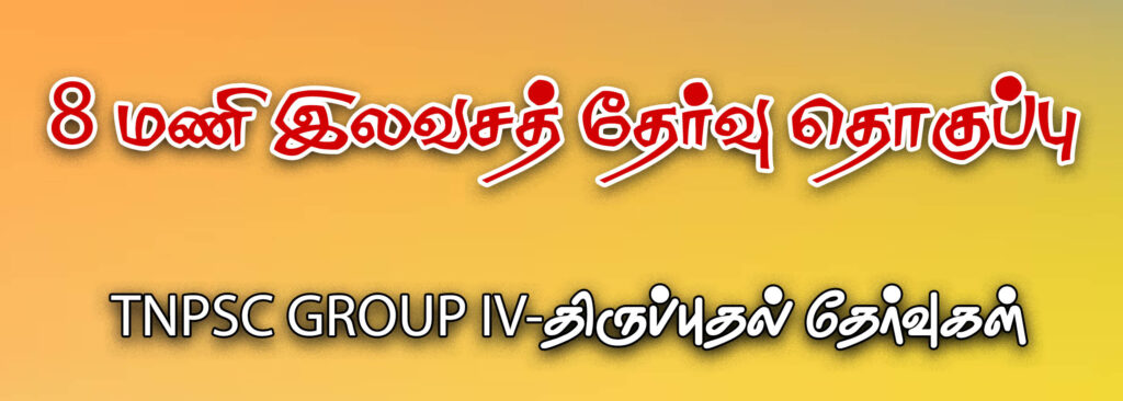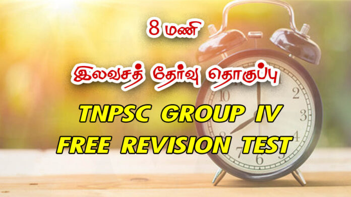 Tnpsc Group-04 தேர்வர்கள் பயன்பெறும் விதத்தில், நமது தமிழ் மடல் இணையம் 8 மணி இலவச தேர்வு தொகுப்பில் 30 தேர்வுகள் கொண்ட Tnpsc Group-04 திருப்புதல் தேர்வு தொகுப்பினை இலவசமாக வழங்குகிறது. இந்த தேர்வுகள் அனைத்தும் இரவு 8 மணிக்கு, நமது தமிழ் மடல் வாட்ஸப் மற்றும் டெலிகிராம் குழுக்களில் பகிரப்படும். இந்தத் தேர்வுகளுக்கான மதிப்பெண் பட்டியல் மற்றும் வினா விடை தொகுப்பு அடுத்த நாள் மாலை 6 மணிக்கு நமது குழுக்களில் பகிரப்படும்.